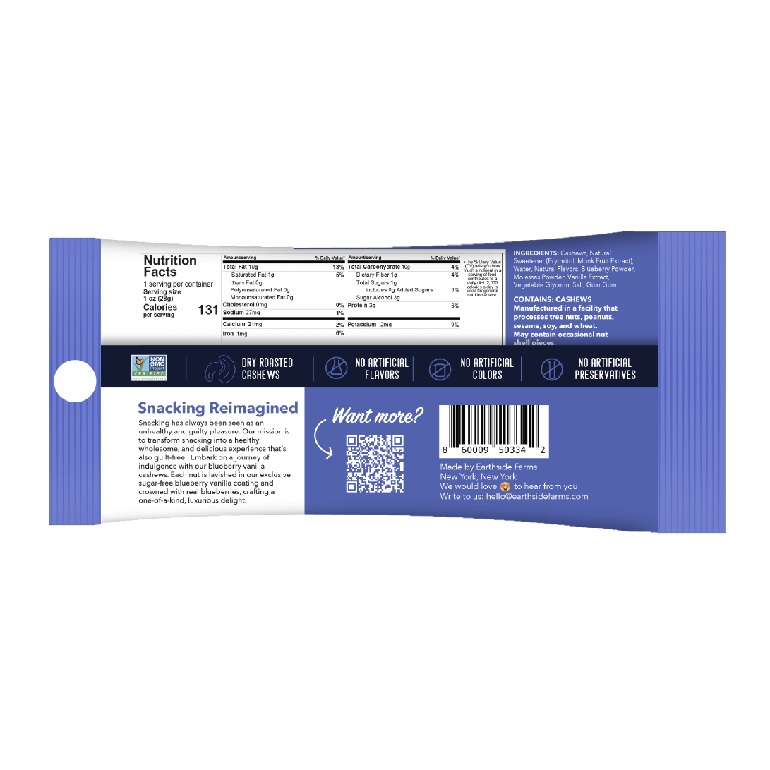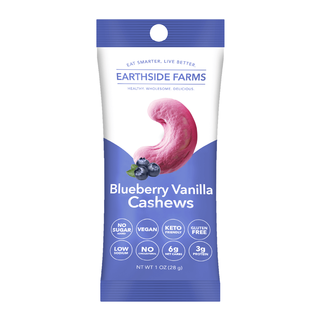 Introducing Earthside Farms Blueberry Vanilla Cashews, the perfect blend of nostalgia and nutrition! These 1 oz peggable, single-serve packs are ideal for a quick snack or guilt-free treat. Our cashews are dry-roasted and coated with a delectable vanilla glaze, made with real blueberries and absolutely no added sugar. Whether you're on a keto diet, looking for vegan and gluten-free options, or just craving something sweet, Earthside Farms has you covered.